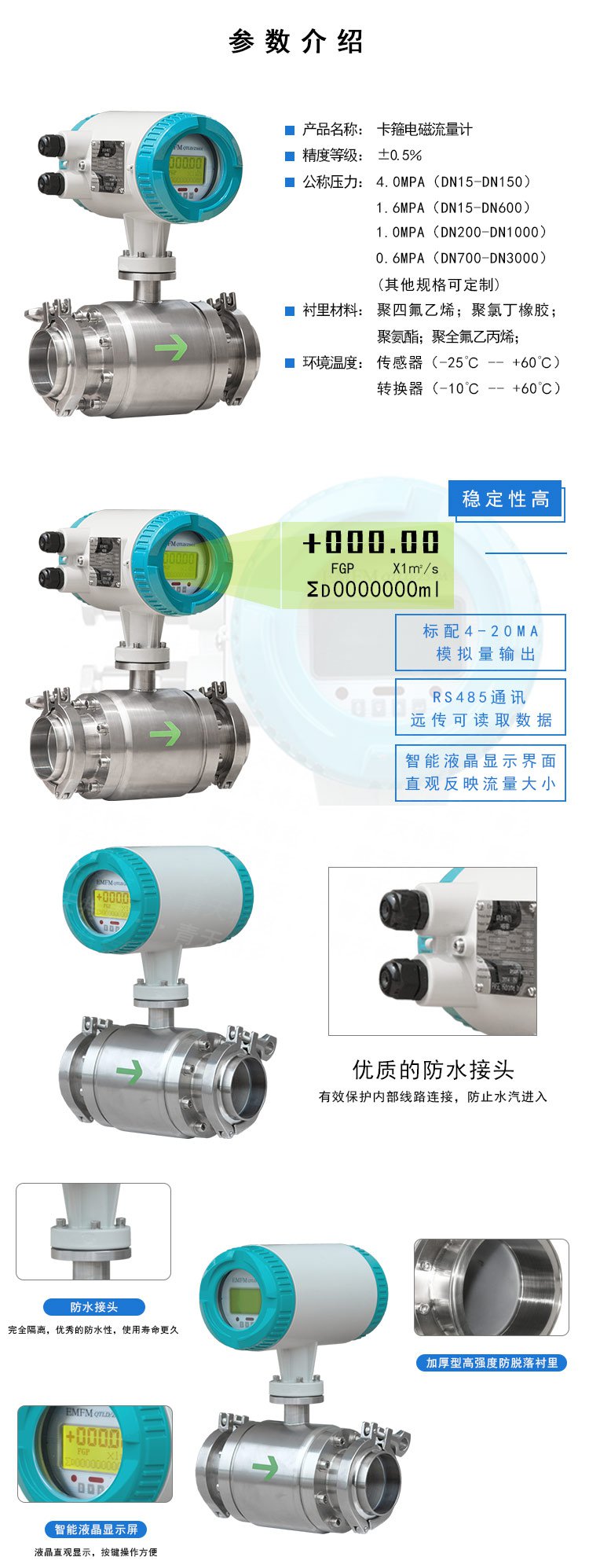 傳感器將感應(yīng)電勢E作為流量信號,傳送到轉(zhuǎn)換器,經(jīng)放大,變換濾波用一系列的數(shù)字處理后,用帶背光的點陣式液晶顯示瞬時流量和累積流量。轉(zhuǎn)換器有4~20mA輸出,報警輸出及頻率輸出,并設(shè)有RS-485等通訊接口,并支持HART和MODBUS協(xié)議。